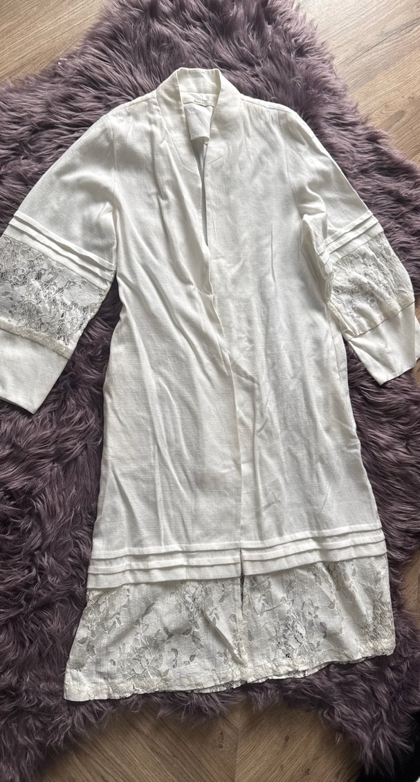 Bohem tarzda, uzun ve bol kesim beyaz sabahlık, kollar ve etek ucu gri nakış detaylı, uzun kollu.