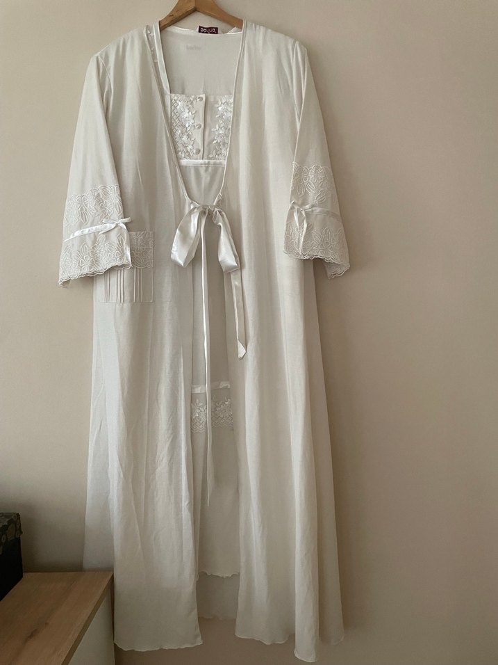 Uzun beyaz kadın sabahlık, nakışlı detaylar, bol kesim, askılı kollu ve bağcıklı kapama ile bohem tarzını yansıtıyor. İç kulkanılmadı dışı sayılı giyildi