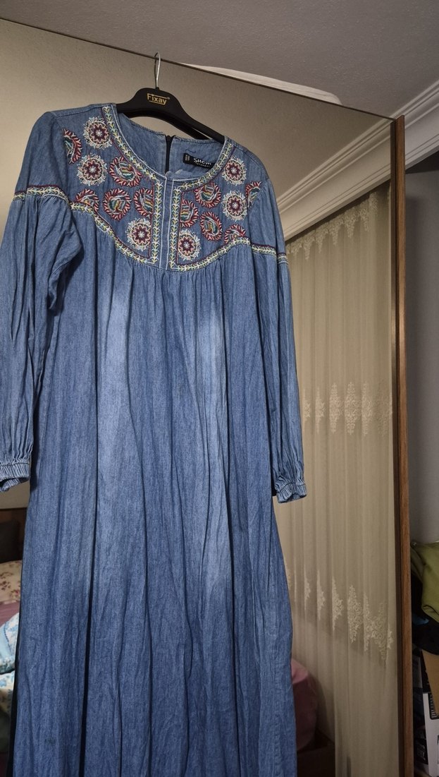 Mavi uzun denim elbise, göğüs kısmında detaylı nakışlara sahiptir. Uzun kollu, yuvarlak yakalı ve bol, dökümlü kesim bohem tarzda tasarlanmıştır.
