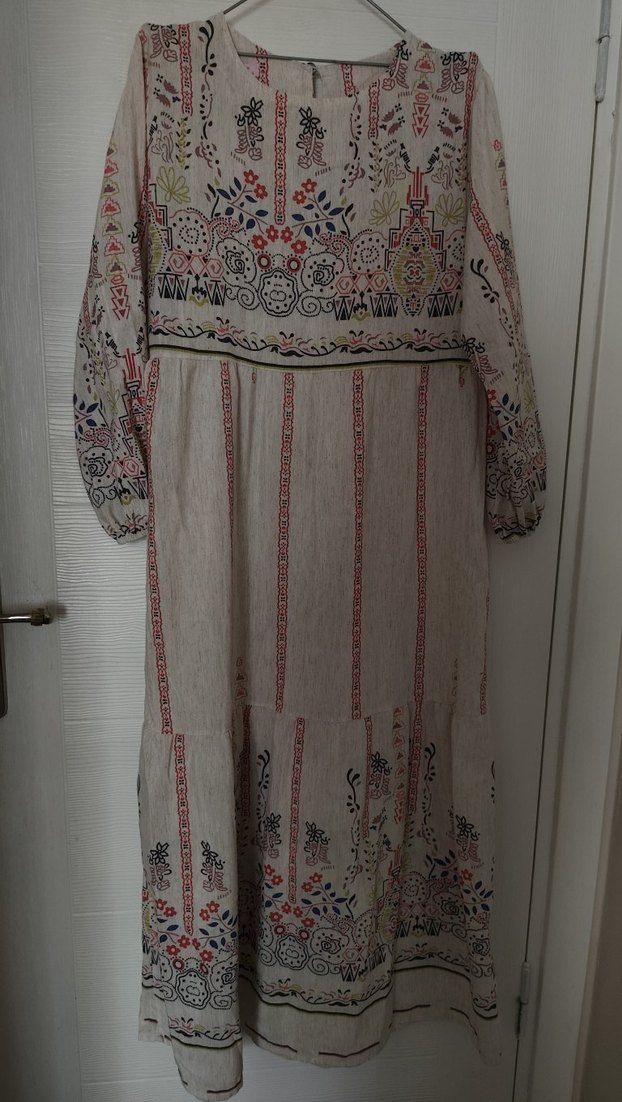 Bu bohem uzun elbise, yumuşak tekstil kumaş üzerinde nakışlı desenlere sahiptir. Bol kesim, drapeli uzun kollu ve tekne yaka ile çok renkli gri zemin üzerinde tasarlanmıştır. Günlük kullanım için uygundur.