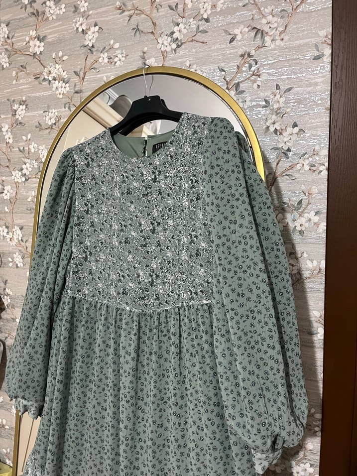 Yeşil uzun elbise, nakışlı detaylar ve fırfırlarla bol kesimdir. Uzun kollu ve yuvarlak yakalı, yumuşak sentetik kumaştan, bohem tarzına uygundur.