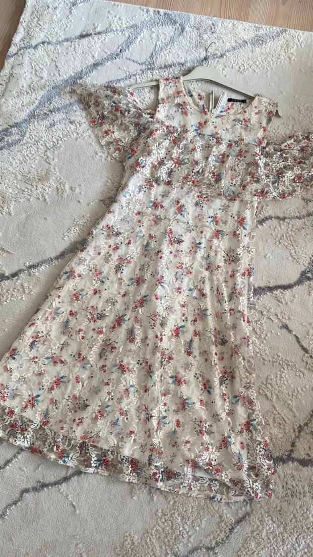 Beyaz renkte, pastel nakışlı çiçek desenleriyle uzun, bol kesim ve kısa kollu bohem tarzı kadın elbisesi.