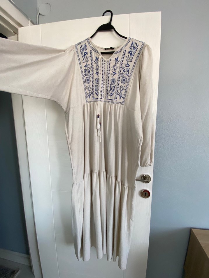 Uzun kollu, yüksek yakalı, ön kısmı nakışlı beyaz keten elbise. Salaş kesim ve püskül detaylarıyla bohem tarzda, günlük kullanıma uygun. Hafif iç gösteriyor ama içlikle halledilir ön püskül ipinde yıkamadan dolayı biraz sökülme var sadece bir kere giyildi bel ölçüsü 57 cm boy:130 cm
