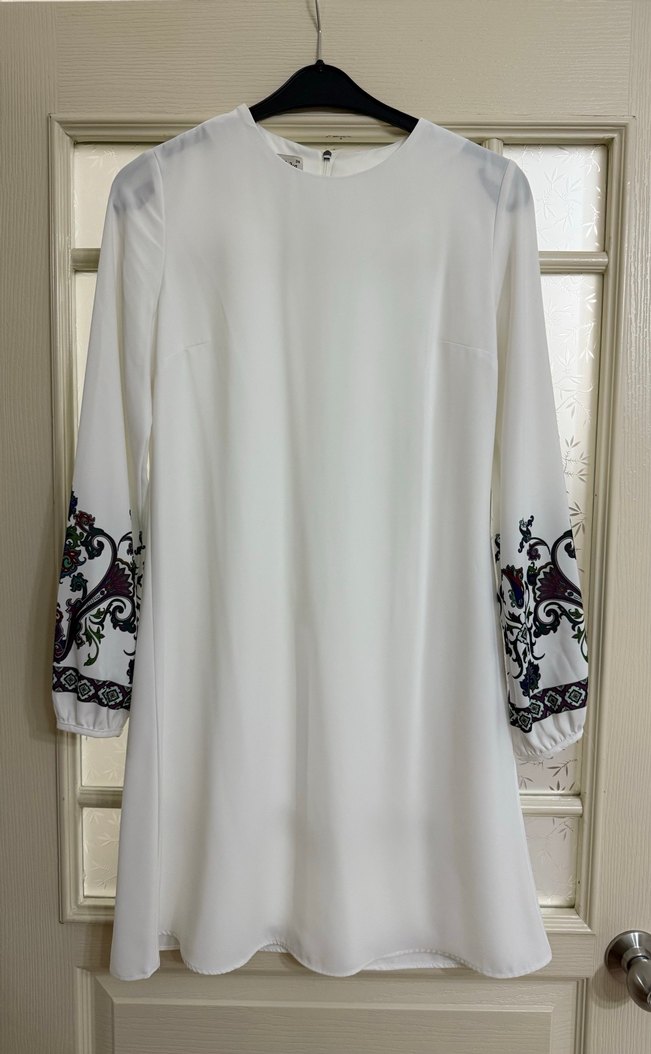 Uzun kollu, nakışlı detaylara sahip bol kesim beyaz tunik. Yuvarlak yaka ve drapeli tasarımla, yumuşak sentetiktir. 38 bedendir bir kere giyilmiştir.