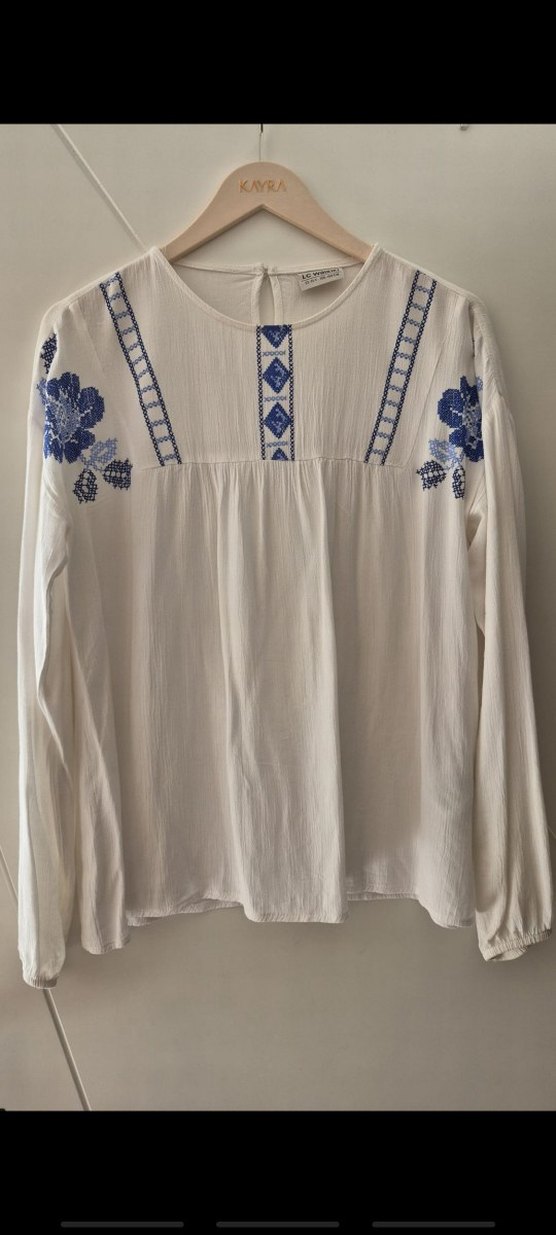 Mavi nakış detaylı, uzun kollu beyaz pamuklu, bol kesim bluz. Yuvarlak yaka ve düğmeli arkasıyla günlük kullanıma uygun.13 14 yaş