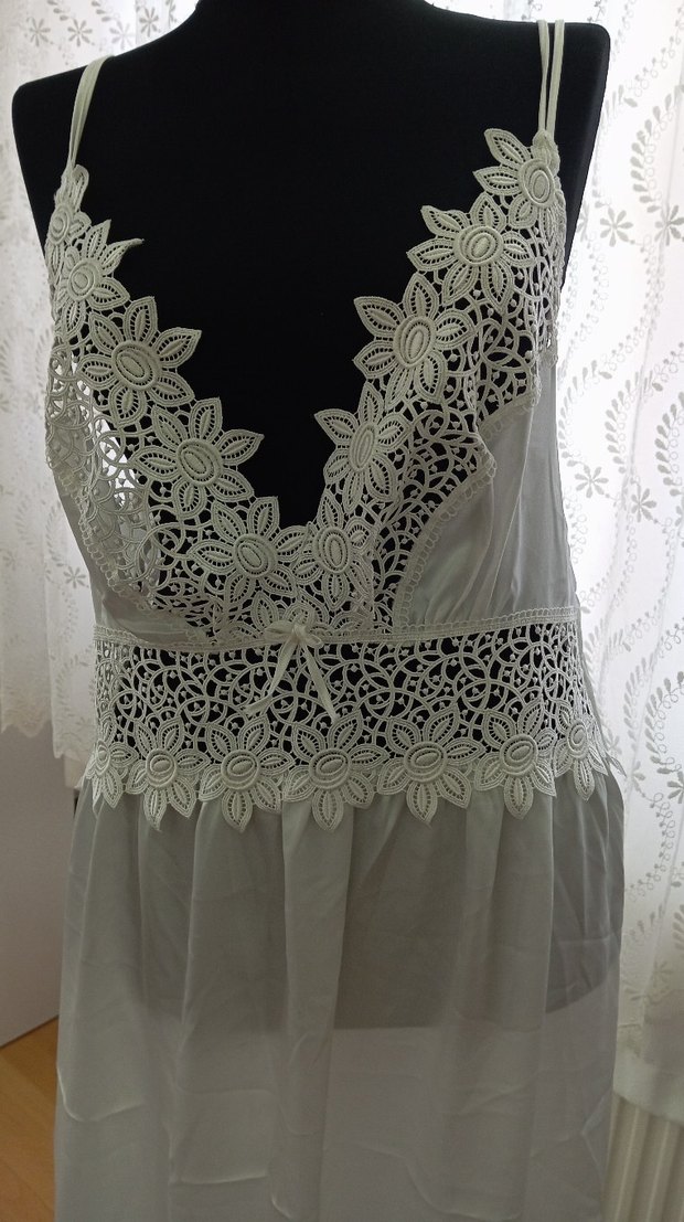Kolsuz, bohem tarzda, beyaz nakışlı, bol kesim ve uzun boyda kadın geceliği.
