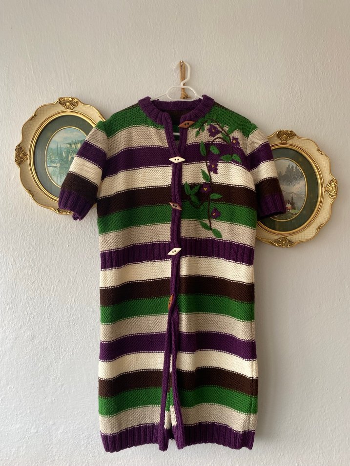 Bu kadın triko hırka, uzun kollu ve yüksek yakalı olup nakışlı detaylara sahiptir. Koyu mor, yeşil, kahverengi ve krem çizgilerle vintage bohem tarzını yansıtır. Bel genişliği 50 cm, boy 85 cm, omuzdan omuza 43 cm. El örgüsü, çiçek motifli, renkli hırka. Örgü olduğu için esneme payı var. Artık kullanılmadığı için satıyorum. Üzerinde çok hafif bir leke var ne olduğunu bilmediğim, son fotoğrafta görebilirsiniz. Marka temsilidir. #hırka #elörgüsü #motif