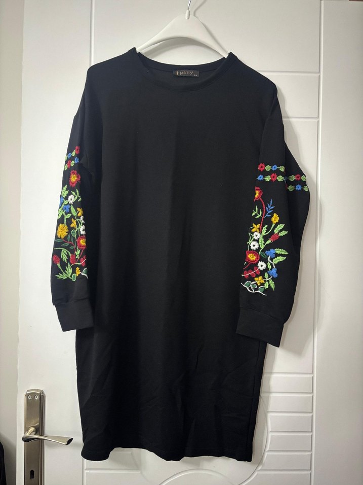 Renkli çiçek nakışlı, uzun kollu, yuvarlak yakalı, bol kesim triko kumaştan yapılmış uzun tunik. Günlük sokak stili için uygundur. S M BEDEN