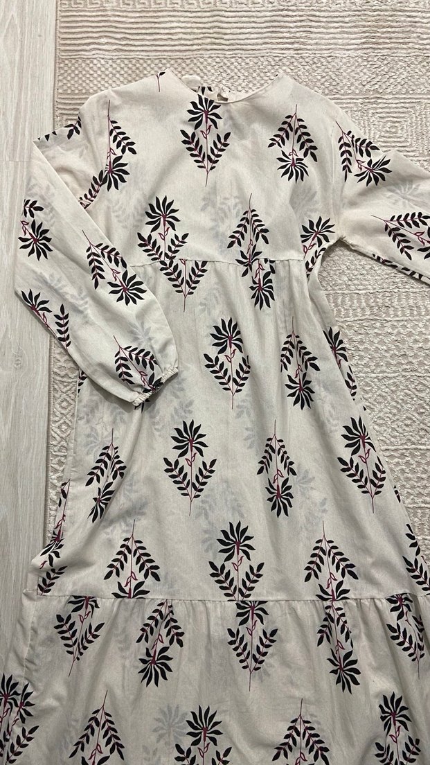 Nakışlı desenlere sahip beyaz uzun elbise, bol kesimi, uzun kolları ve V yaka ile bohem tarz sunar. Fırfır detaylarıyla günlük kullanıma uygundur. S-m-l uyumlu