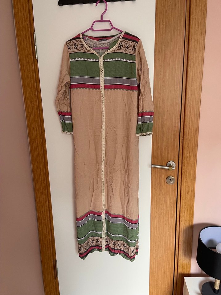 Nakışlı, uzun kollu, tekne yaka ve bol kesimli bu bohem uzun elbise, hafif çok renkli desenlere ve drapeli tasarıma sahiptir.