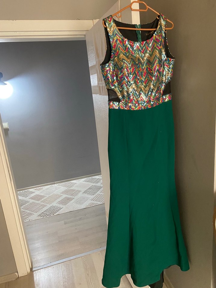 V yaka, kolsuz, drapeli ve nakışlı üst kısmı ile koyu yeşil uzun etekli bohem tarzda, düzenli kesim elbise. Düğünler için uygun.