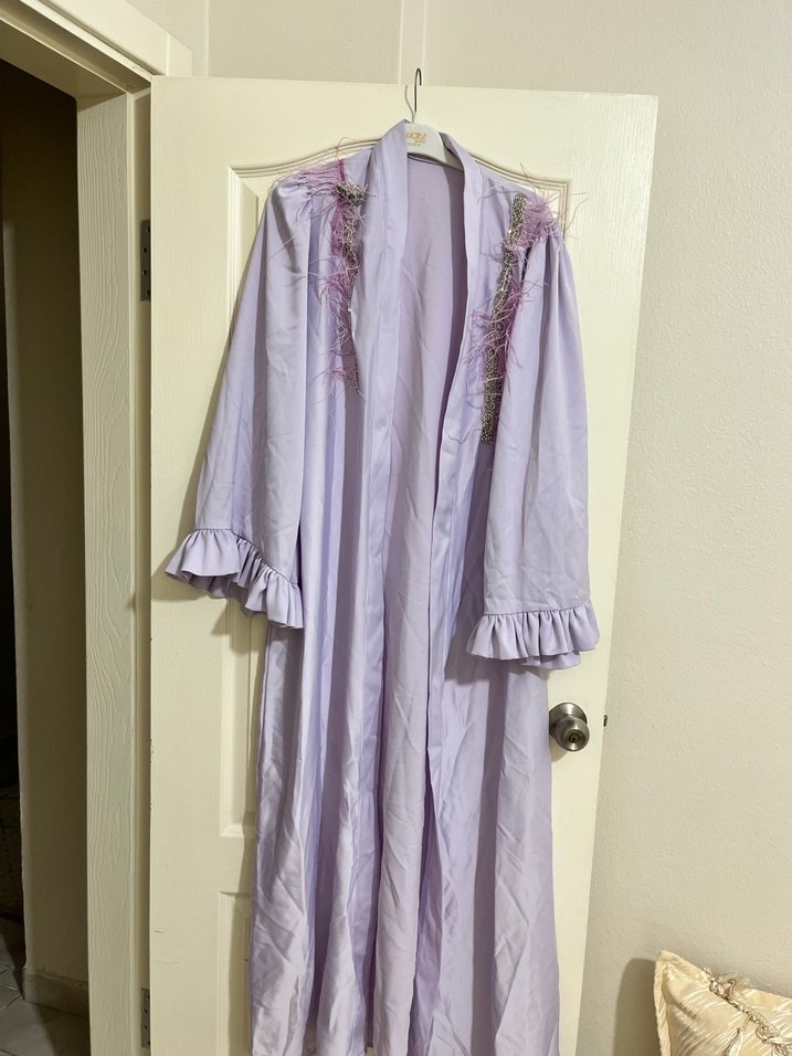 Pastel mor renkte, uzun kollu ve volanlı manşetli, nakış detaylı, bol kesim bohem tarzı uzun kadın sabahlığı.