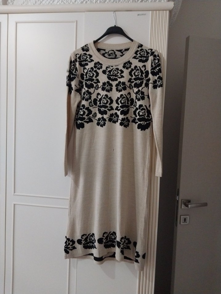 Uzun triko tunik, yuvarlak yaka ve uzun kollu. Gri zemin üzerinde siyah nakışlı çiçek desenleri bulunur. Bol kesim, vintage ve bohem tarzda. ( ön ve arka kısımda ufak dikiş söküğü mevcut resimlerde belirttim)