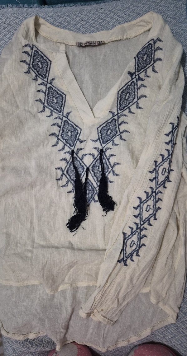 Gri nakışlı desenlere sahip beyaz tekstil bluz, V yaka ve püsküllü detaylarla, uzun kollu ve bol kesim bohem tarzda. Günlük kullanım için uygun.