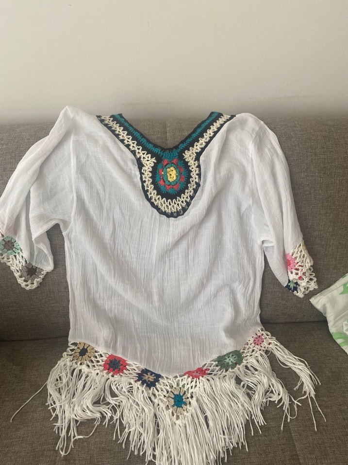 Rahat kesim tunik, V yaka ve renkli örme nakış detaylıdır. Yumuşak dokulu kumaştan, kısa kollu ve günlük kullanıma uygundur. En 55 uzunluk 89 cm şile bezi kumaşı marka temsilidir