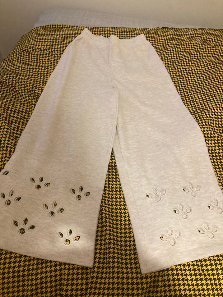 Bol kesim, uzun beyaz triko pantolon, nakışlı detaylar özel ve şık bir görünüm sunar.
