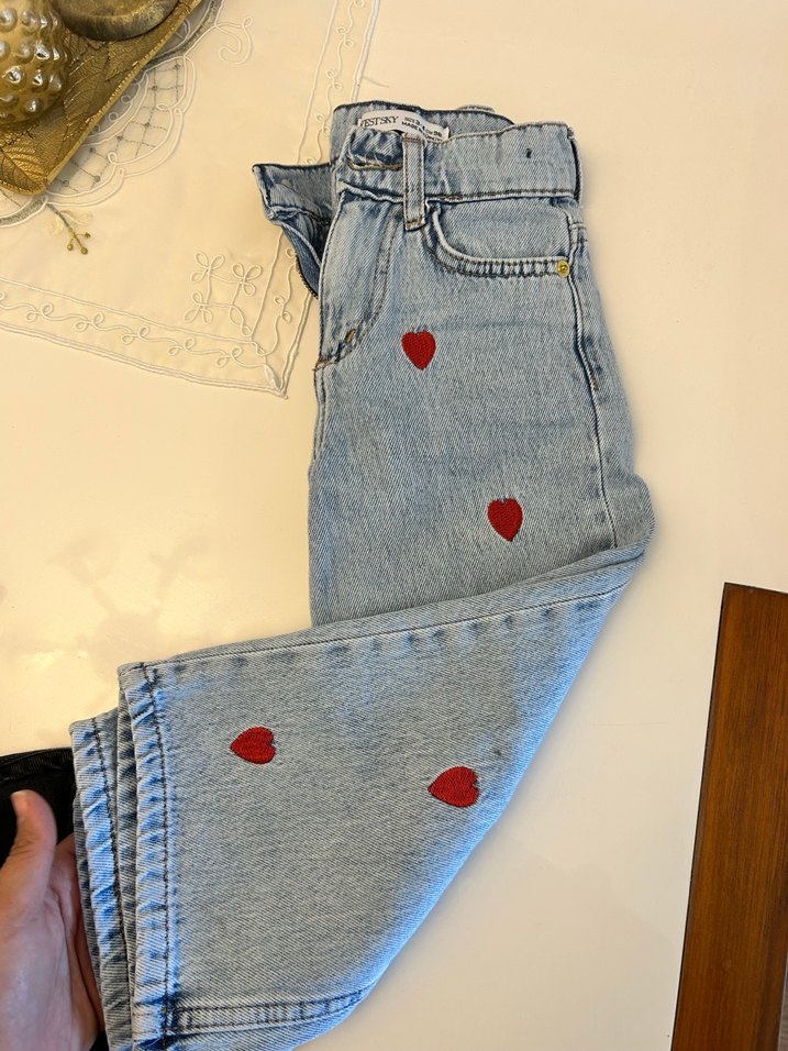 Bol kesim, nakışlı kırmızı kalplerle süslenmiş kot pantolon. Düğmeli kapanışlı, sokak stiline uygun rahat kesim. ❤️
