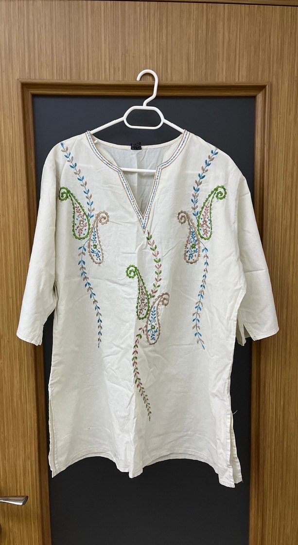 V yaka, kısa kollu, nakışlı ve boncuk detaylı beyaz midi boy bohem tunik. Rahat kesimli ve tekstil kumaştan üretilmiştir.