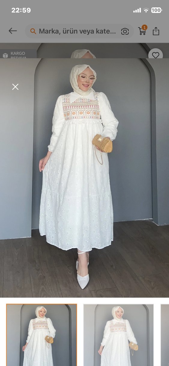 Nakışlı ve boncuk detaylı uzun beyaz elbise, yumuşak pamuktan üretilmiştir. Uzun kollu ve yüksek yakalı, bol kesimli bohem tarzda rahat bir modeldir. markas belirsz