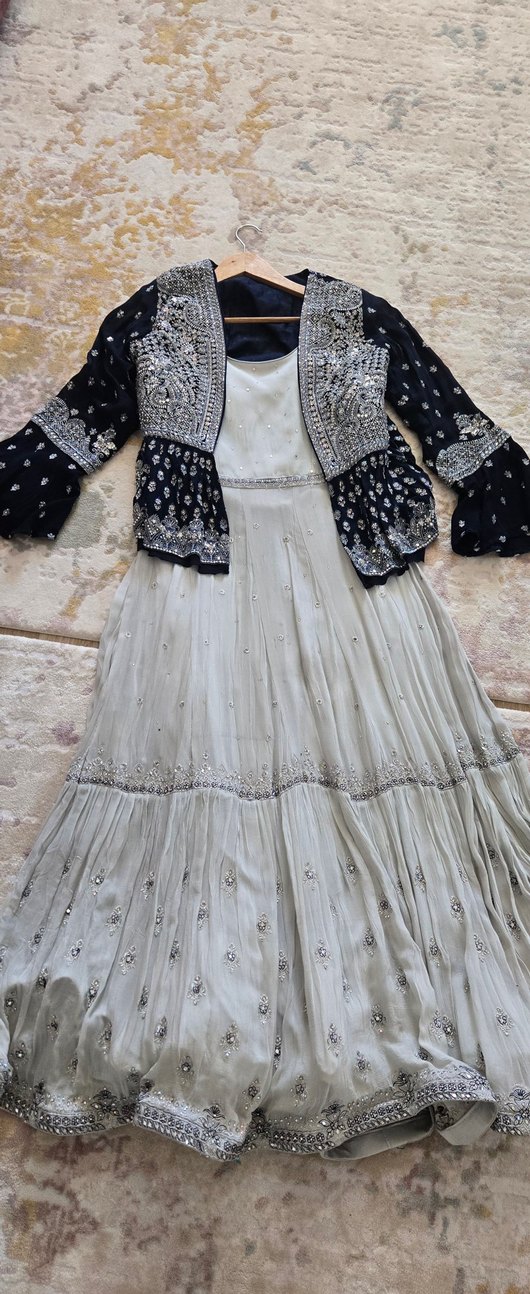 kolsuz, nakışlı ve boncuk işlemeli detaylara sahip bol kesim uzun elbise. Üzerinde lacivert nakışlı ceket bulunuyor. Düğünler için uygun... Ithal bir parça hindistan'dan aldım. Uzunluk 48 cm'dir. Elbise üzerinde güzel işcılık var. arkada çok küçük bir delik var fotoğrafta gosterdi gibi ceket giyse saklanır bir tane en altta tarfta da var ama hiç belli etmiyor ... 1 defa tek kullanıldı
