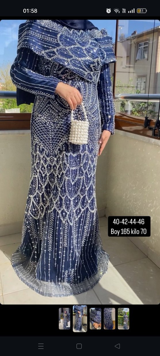 Nakışlı Boncuk İşlemeli Uzun Lacivert Elbise