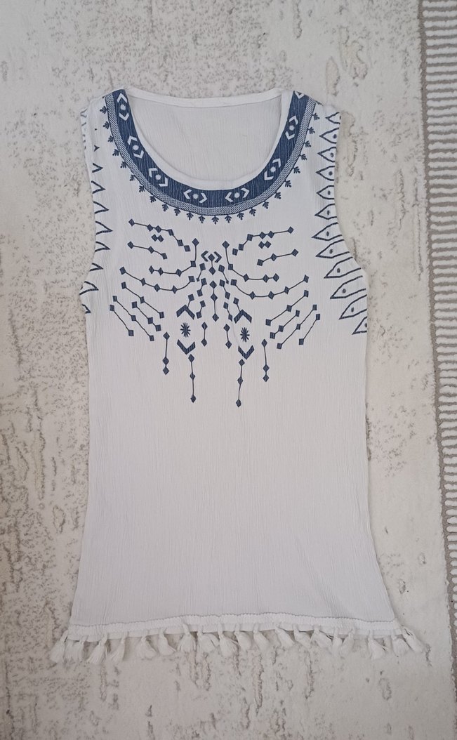 Kolsuz beyaz kadın üstü, nakışlı ve boncuk detaylıdır. Yuvarlak yaka ve bol kesimlidir. Bohem tarzda, midi boy ve püsküllü etek ucu vardır.