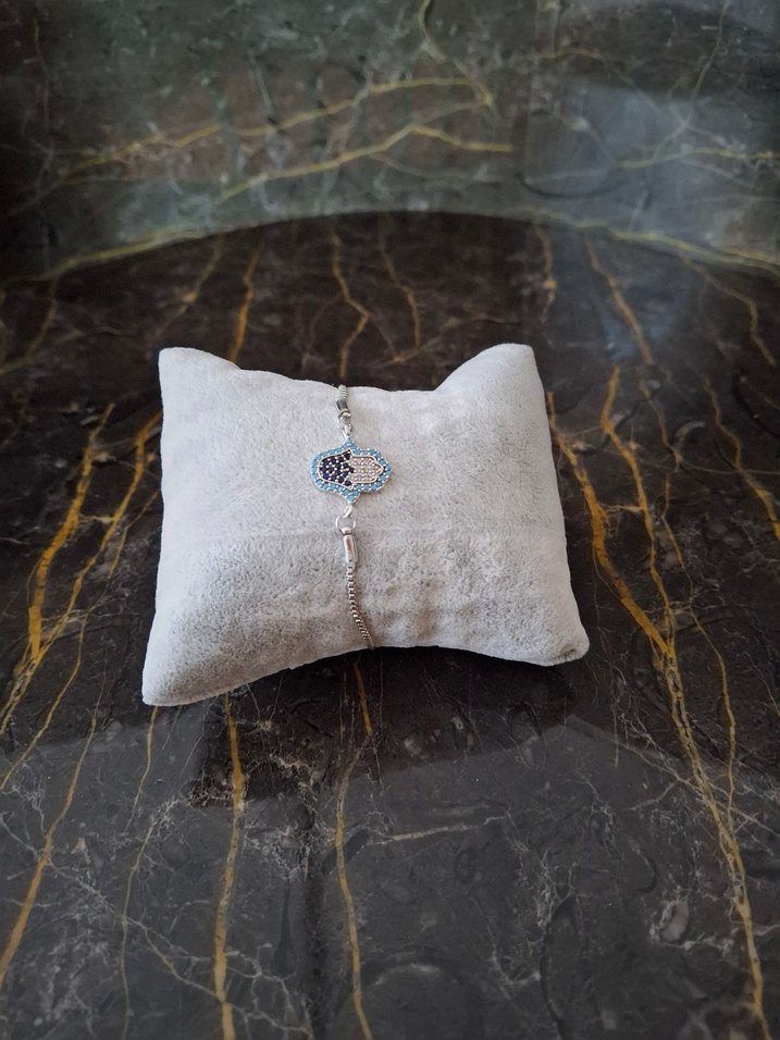 Bej ve gri tonlarda nakışlı detaylara sahip boncuklu bileklik, bohem tarzını yansıtarak günlük kullanıma uygundur.