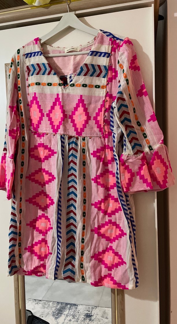 Bu uzun, bol kesim bohem elbise, canlı pastel nakışlar ve boncuk detaylarına sahiptir. 1 kez giyildi s beden ama m l bedenede olur deniz ve günlük elbise olarak kullanıma uygundur mudonun ürünüdür boy 85 en 50 kol 49