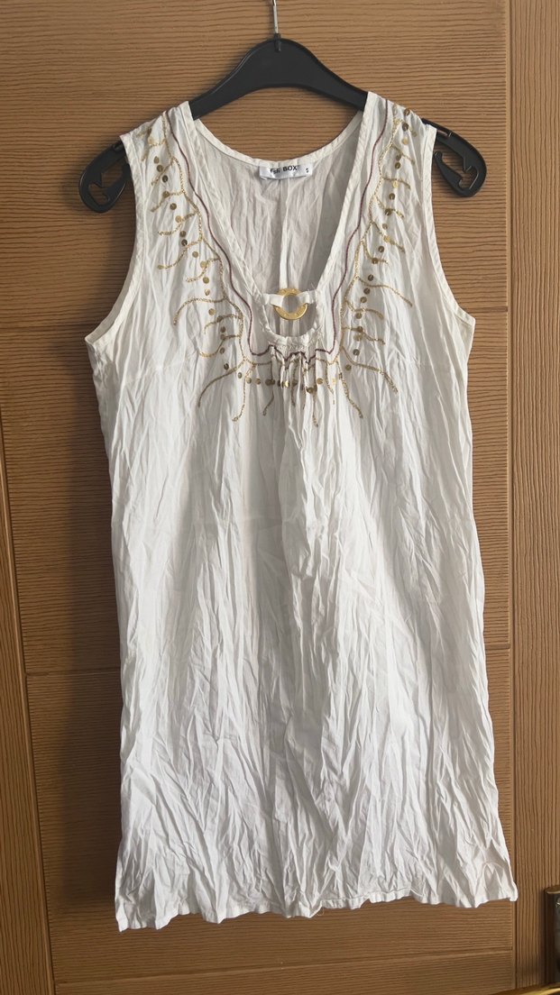Pamuklu keten kumaştan, nakışlı ve boncuk detaylı, V yaka, kolsuz, bol kesim beyaz uzun tunik.