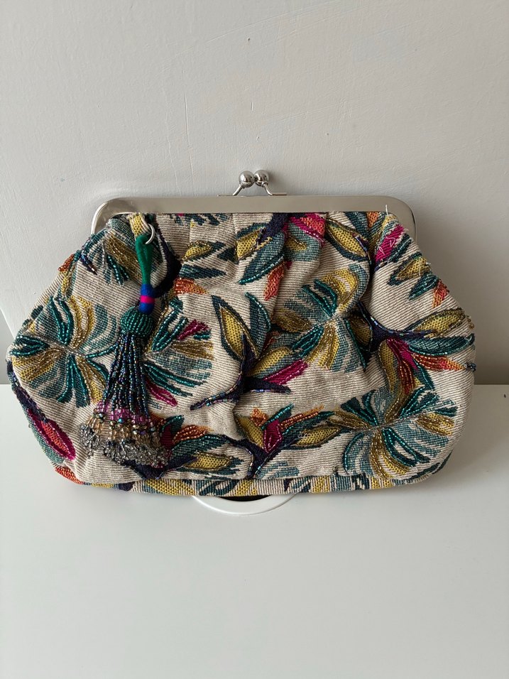 Nakışlı desenlere ve boncuklu püskül detaylara sahip, çok renkli bohem tarzda tekstil kadın portföy çanta, günlük kullanıma uygun.