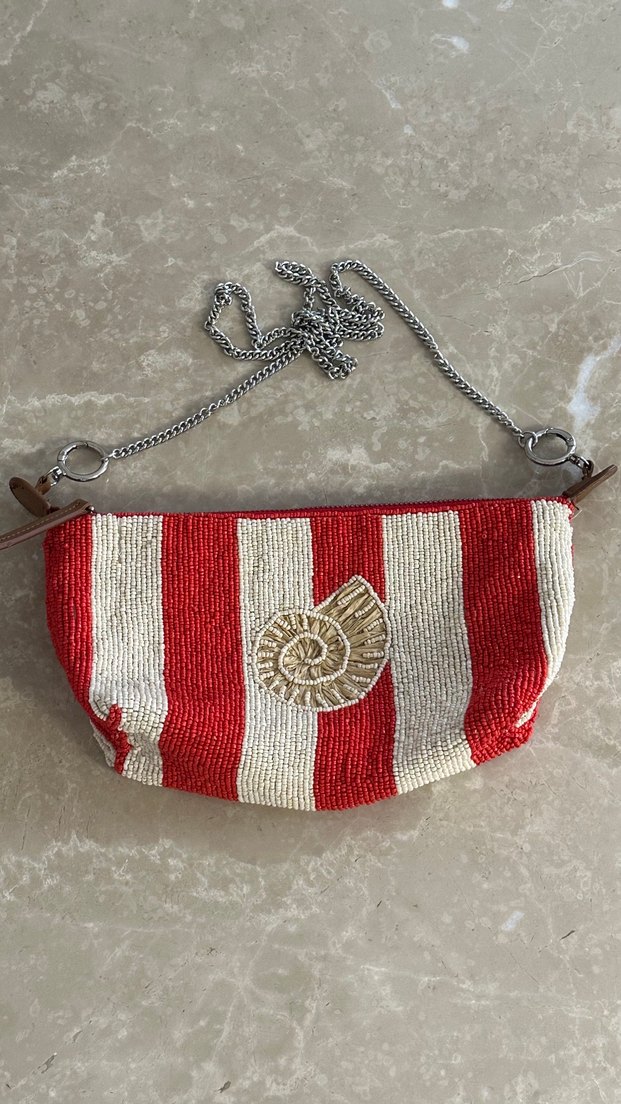 Kırmızı ve beyaz çizgili, boncuk işleme detaylı örme çanta. Zincir askılı, birbirine bağlanabilir şekildedir.