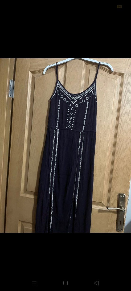 Lacivert uzun elbise, ince askılı ve V yakalıdır. Nakışlı desenlere ve boncuk süslemelere sahiptir, bohem tarzını yansıtır.
