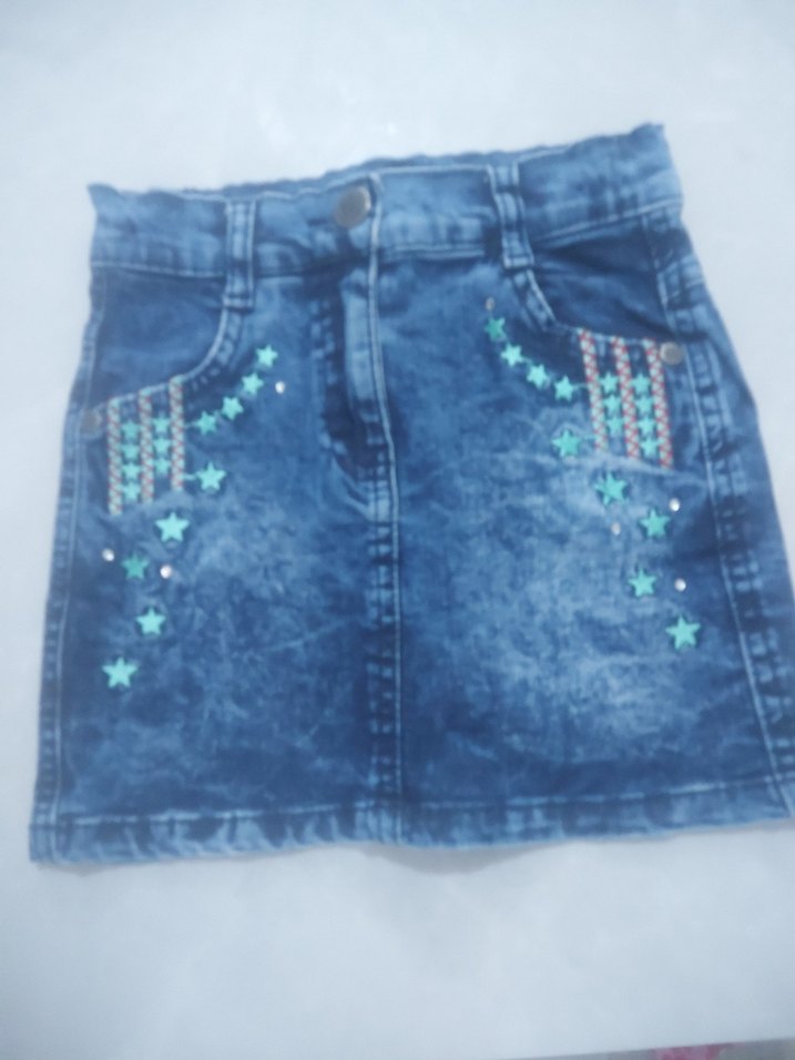 Boncuk ve renkli nakış detaylarıyla süslenmiş, dar kesim mavi kız kot eteği.