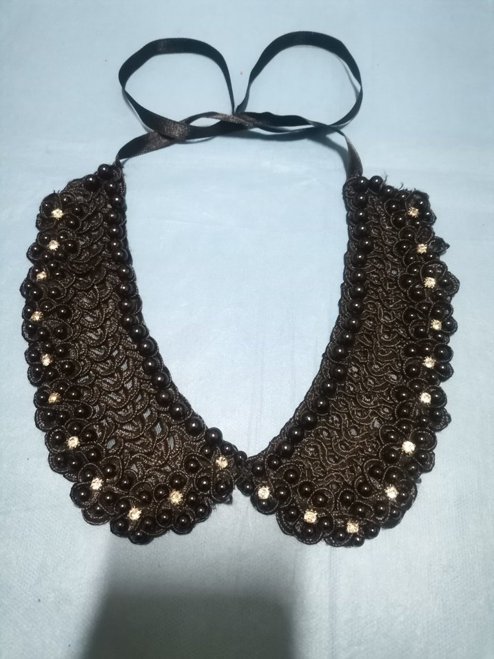 Nakışlı detaylar ve boncuk süslemeleri bulunan siyah midi uzunlukta, kurdele bağlamalı kolye. Günlük kullanım için uygundur. #kolye #yaka #yakalık