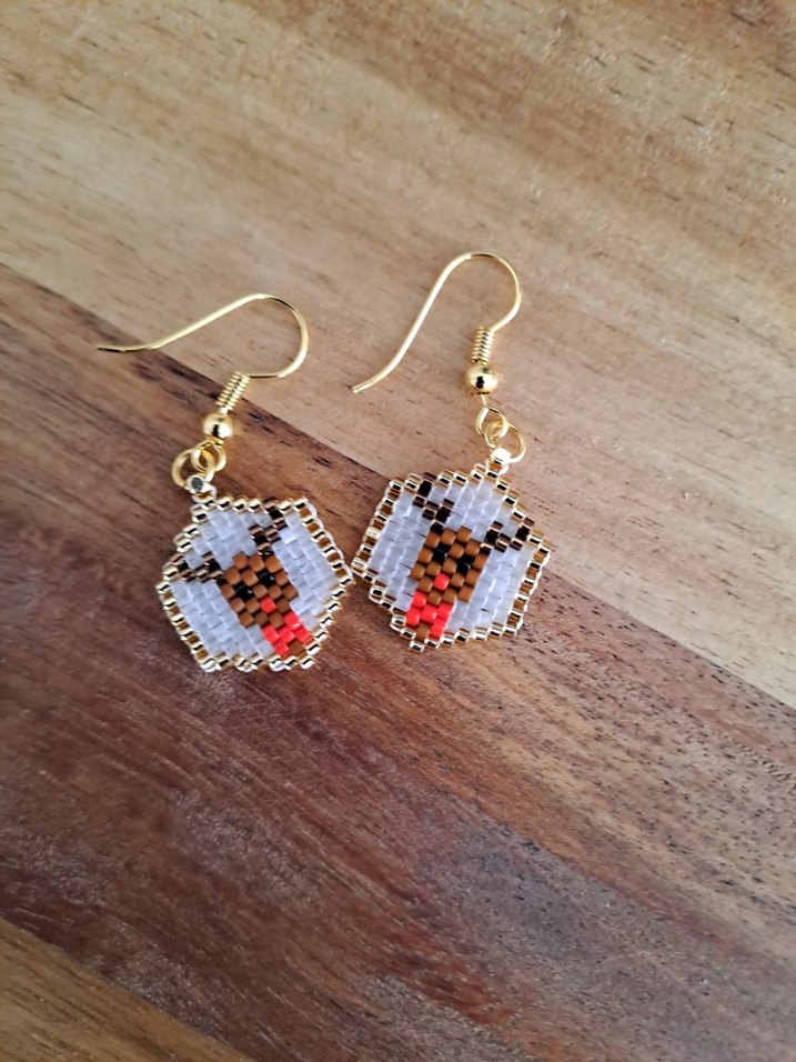 Renkli bej tonlarında nakışlı, boncuklu kısa bohem tarzı küpeler, romantik gece için uygun. miyuki bonciklarla hazirlanmistir