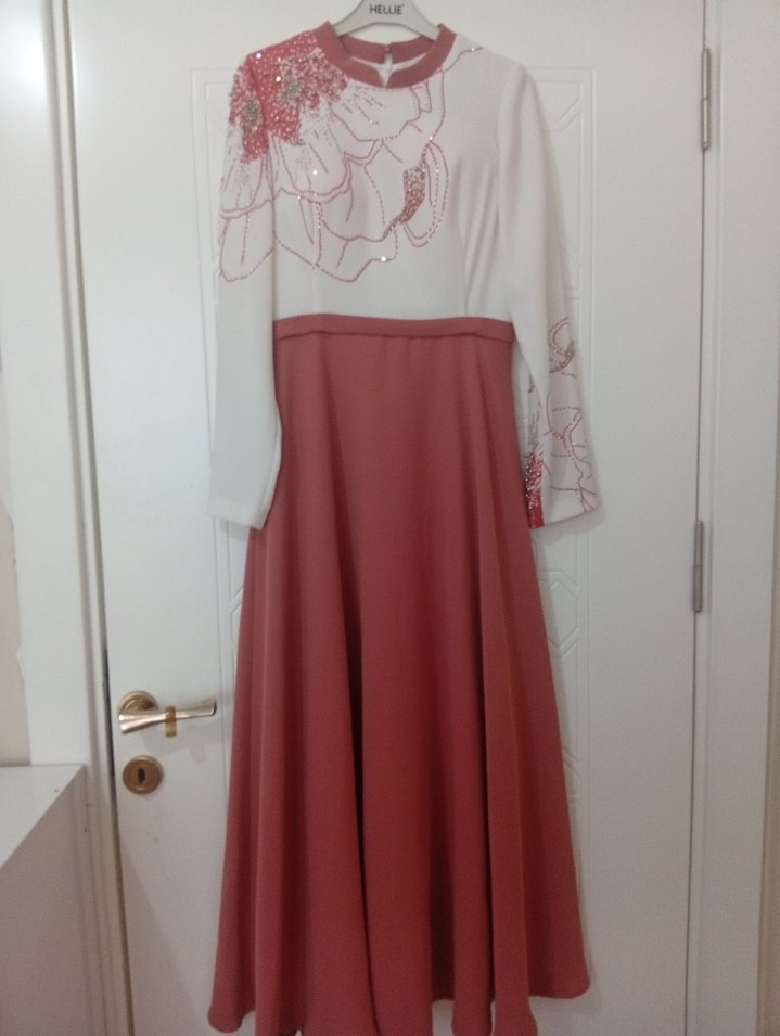 Kadınlar için uzun, bol kesim, drapeli ve uzun kollu abiye elbise. Yuvarlak yakalı, pastel pembe nakışlı,boncuklu, düğünler için uygun.