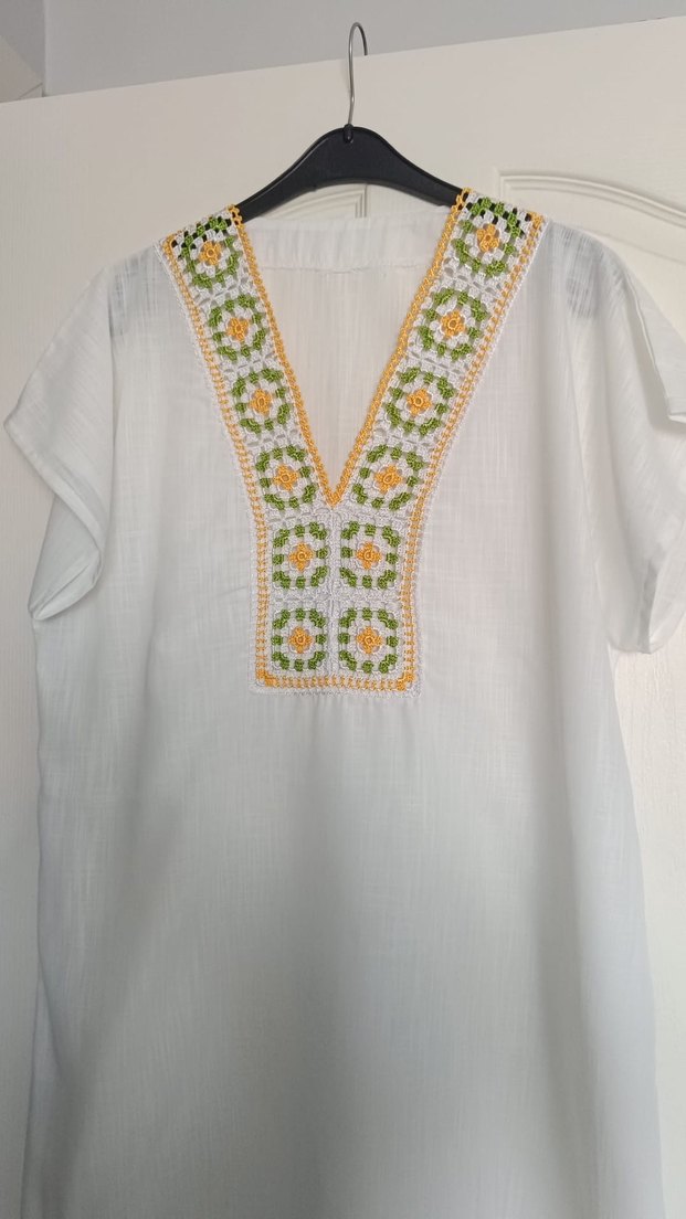 V yaka, nakışlı çiçek desenli ve boncuk detaylı beyaz pareo. Yumuşak tekstil malzemeden, bol kesim ve günlük kullanım için uygun.
