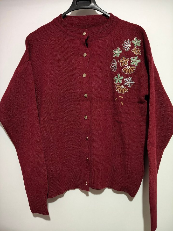 Bordo renkli, uzun kollu, yuvarlak yaka ve düğmeli örme kadın hırkadır. Canlı renkli nakışlı çiçek desenleri ve bol, midi boy kesimiyle rahat bir görünüm sunar.