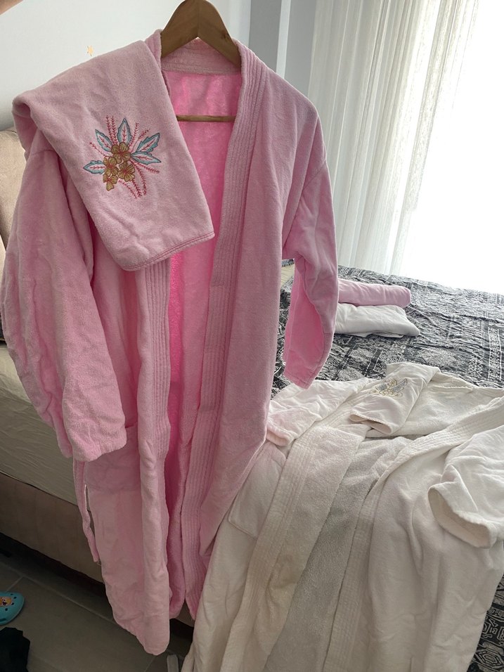 Yazlıkta kullanmak için alınmıştı 10 kere falan kullanıldı Nakışlı detaylara sahip pembe kız bornozu ve havlu seti, yumuşak tekstil malzemeden üretilmiştir, banyo sonrası rahatlık sağlar.