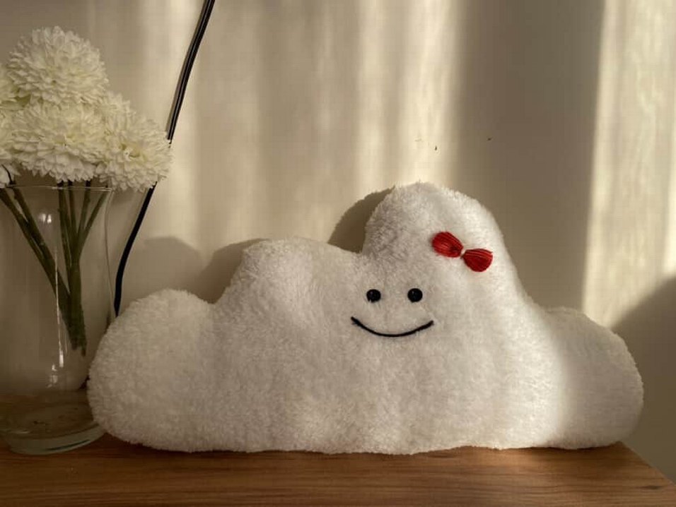 Yumuşak ve kabarık beyaz bulut şeklinde çocuk yastığı, nakışlı gözler, gülümseme ve kırmızı fiyonk detaylı. Çocuk odalarına sıcaklık katar. ☁️