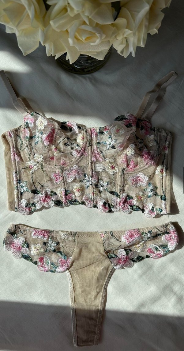 Bej renkte, pastel çiçek işlemeli büstiyer ve külot takımı. Normal midi uzunlukta, ayarlanabilir askılı. Etiketli üründür. 80-85-90 bedenleri mevcuttur.