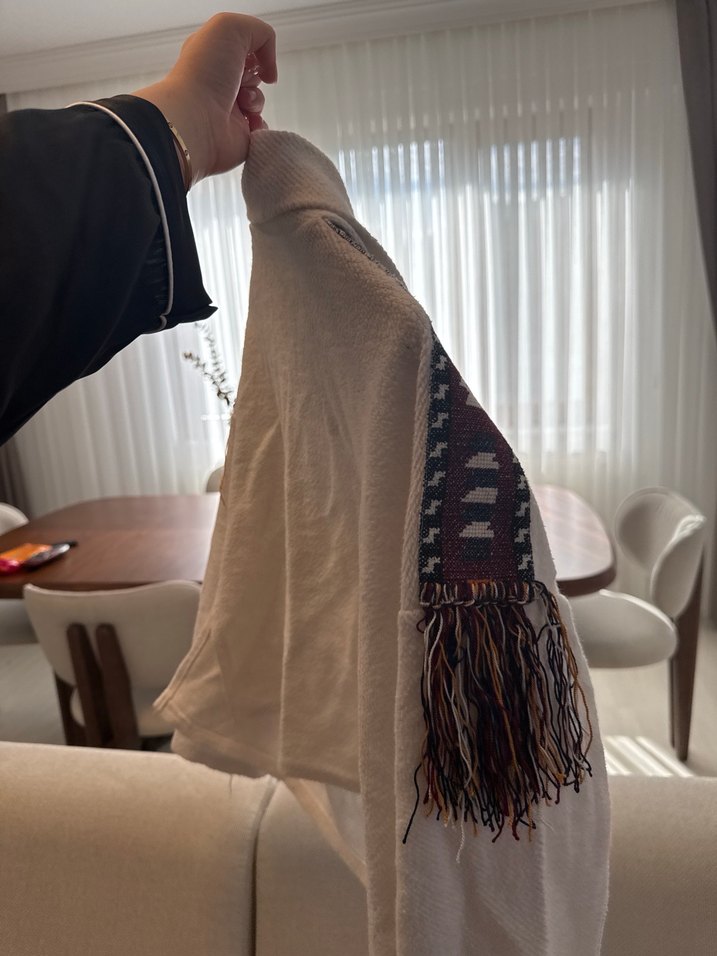 Nakışlı desenlere sahip, camel ve gri tonlarında, çok renkli püsküllerle tamamlanmış battaniye. ️