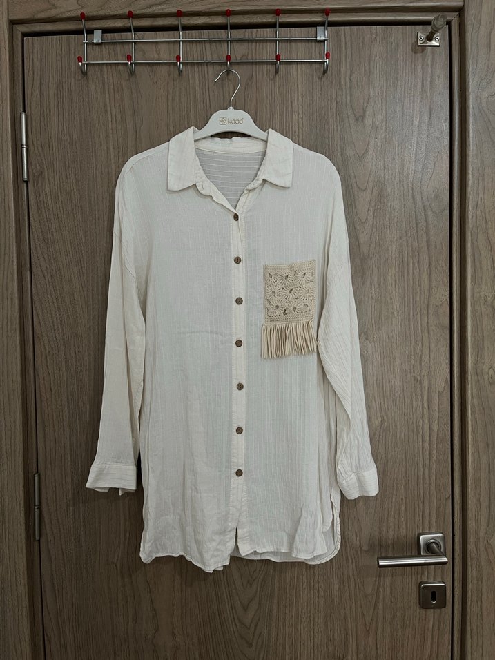 Beyaz keten gömlek, uzun kollu ve yakalıdır. Düğmeli ön kısmı ve nakışlı püsküllü cep detayıyla bohem tarzı yansıtır. Günlük kullanıma uygundur.