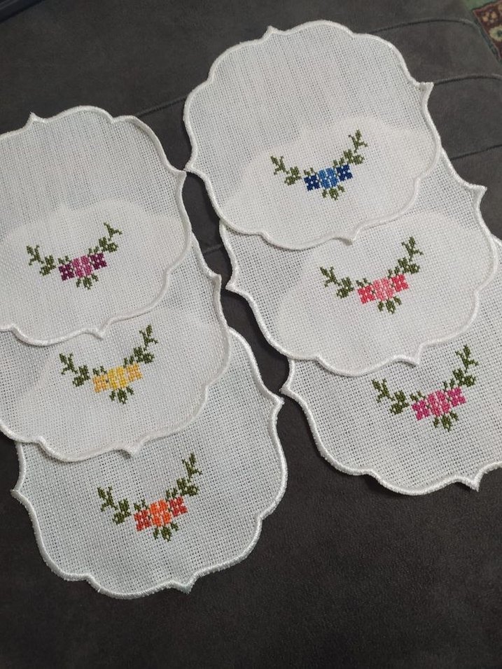 Beyaz kumaş üzerine renkli çiçek işlemeli, kenarları dalgalı 6 parça have sunum peçetesi. kişiye özel sipariş alınır.