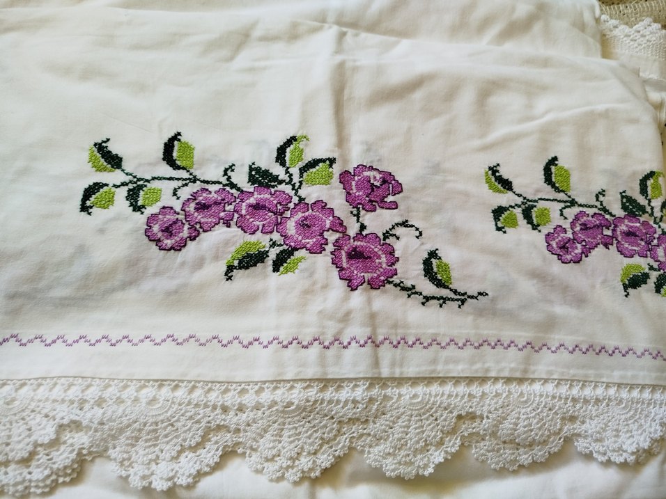Beyaz zeminde pembe ve yeşil renklerde geleneksel çiçek desenli el işi nakışlı kumaş.