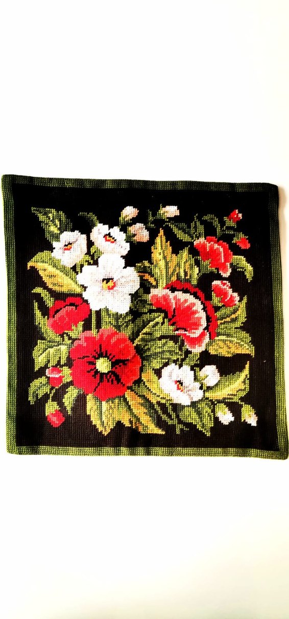 Siyah zemin üzerinde kırmızı, beyaz ve yeşil tonlarda nakışlı çiçek desenli koyu renkli kırlent kılıfı.
