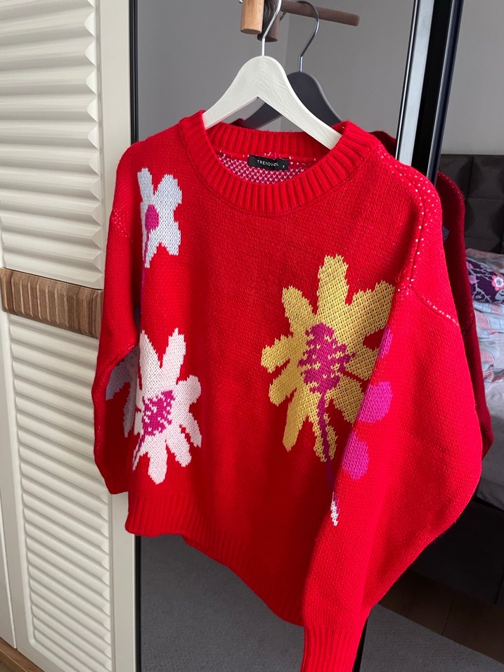 Nakışlı çiçek desenleriyle renkli kırmızı triko kazak, uzun kollu ve yuvarlak yakalıdır. Bol kesim ve bohem tarzıyla rahat kullanıma uygundur.