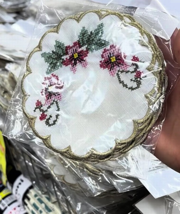 kahve sunum peçetesi Beyaz kumaş üzerine işlenmiş pembe çiçekler ve yeşil yapraklar bulunan, altın renkli kenar detaylı yuvarlak amerikan servis. 6 adetten oluşmaktadır.. yeni ürün