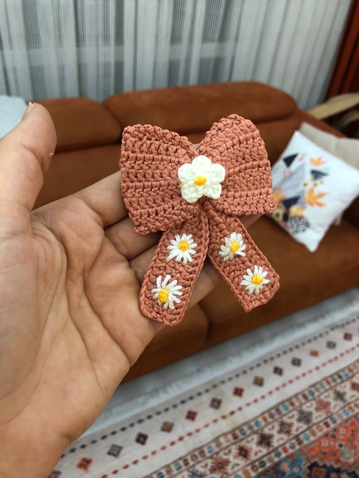 Bohem tarzda kahverengi saç tokası, nakışlı renkli çiçeklerle süslenmiş fiyonk detayıyla dikkat çekiyor.
