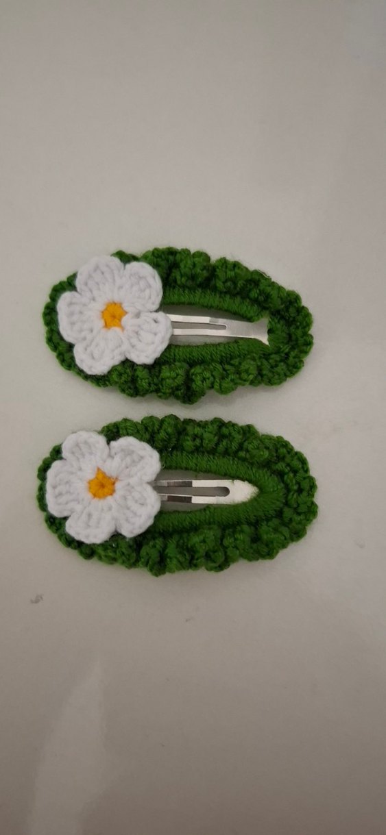 Örgü yeşil tabanlı, nakışlı beyaz çiçek detaylı bohem tarzı çocuk tokasıdır.